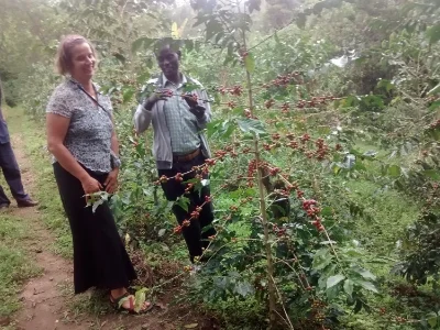 Touring coffee grove at Aregesh Lodge in Ethiopia with Genene, Sidama Region's Bureau of Marketing and Promotion.