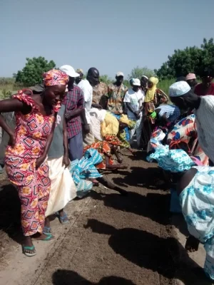 Seed bed preparation for an insectory demonstration plot at Ndoimby village in Senegal. Photo by Erin Schneider